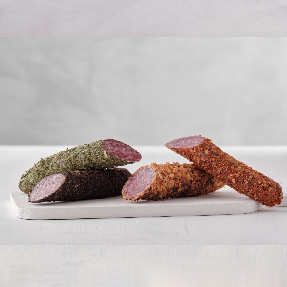 Pack de Fuet de varios sabores: ajo, tomate seco, finas hierbas y aceitunas negras- 360g